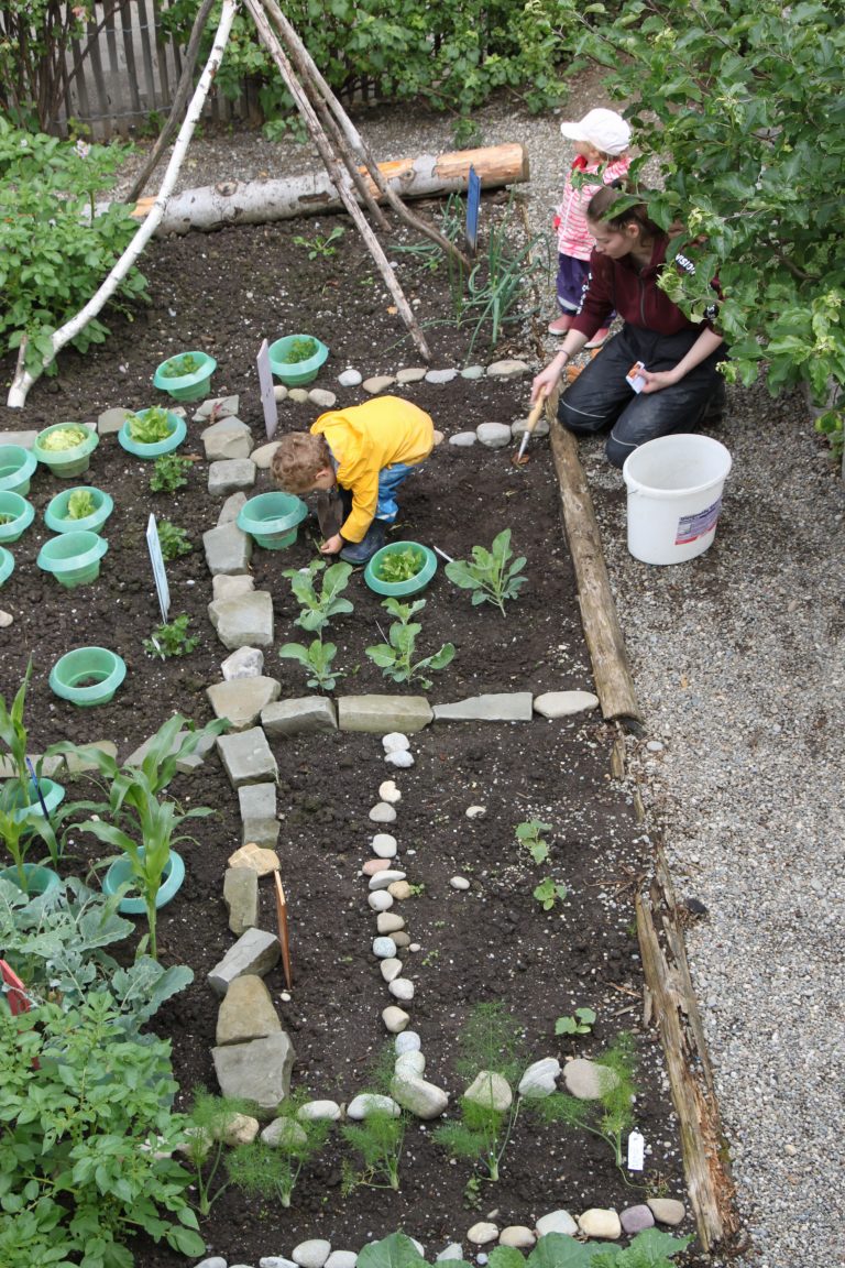 Wir hacken, pflanzen, jäten und giessen den Kitagarten.